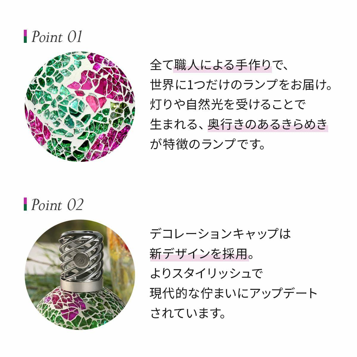 華やかなモザイクガラスのランプボトル1つ1つが全て職人の手作りです。