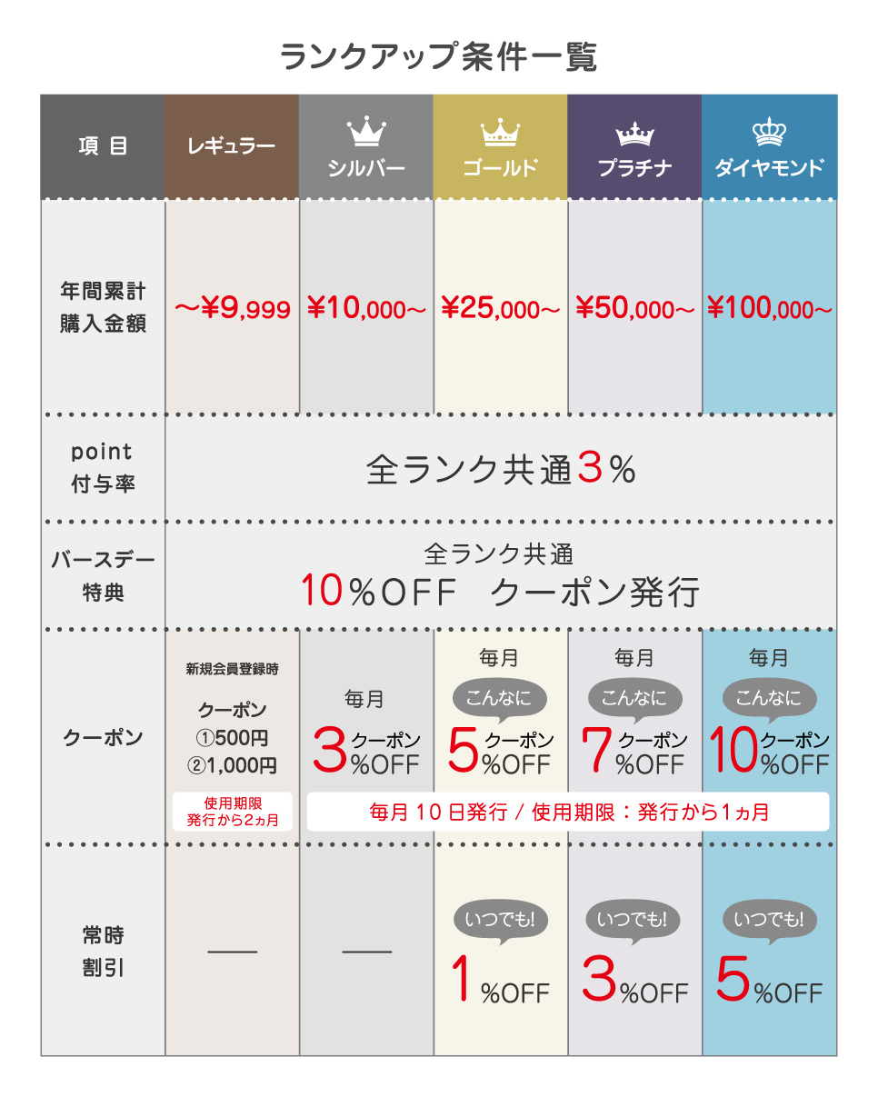 会員ステージがアップするごとに、クーポンの割引率や、会員限定価格の常時割引のお値下げ率など、サービス・特典もグレードアップ!ますますお得にお買い物をお楽しみいただけます。